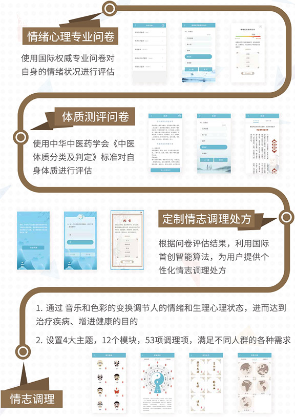 (1)國際首創(chuàng)的融合藝術(shù)、人文、心理學(xué)、中醫(yī)、腦科學(xué)、多媒體等多學(xué)科的情志調(diào)理系統(tǒng),并在慢性疾病非藥物治療領(lǐng)域開展了有益探索。